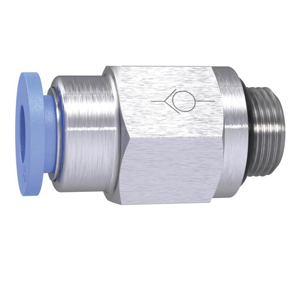 - Den lige kontraventil i Blue-serien er designet til at forbinde slange til udvendigt gevind og tillader kun trykluft at strømme i én retning.