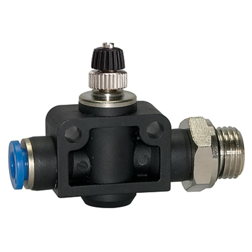 • "Blue Series" drosselventilen i lige design bruges til at regulere strømningshastigheden i én strømningsretning, samtidig med at den tillader fri returstrøm i den modsatte retning i pneumatiske systemer.