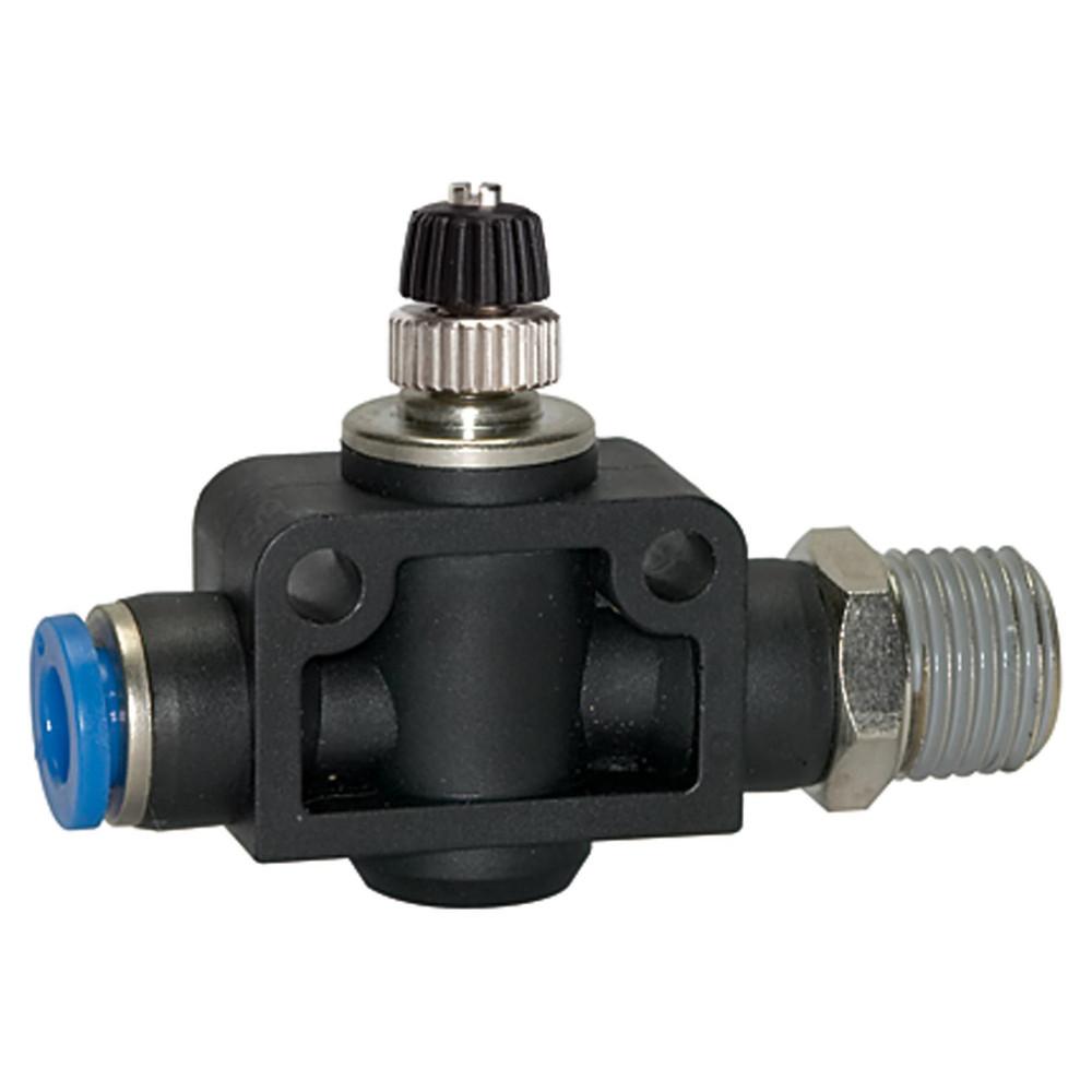 - "Blue Series" drosselkontraventilen i et lige design kombinerer regulering af flowhastigheden med en kontraventilfunktion, således at luftstrømmen kun tillades i én retning, og tilbagestrømning forhindres.
