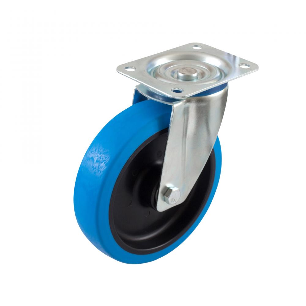 - Hjulkroppen er lavet af plastik med rulleleje og reduktionsbøsning, mens banen er lavet af termoplastisk gummi. Det galvaniserede stålhus har et drejekrans med dobbelte kuglelejer og en pakning med en integreret kugleafstandsstykke. Drejehjulet imponerer med sin støjsvage, afsmitningsfri gang, lave rullemodstand og slagfasthed.