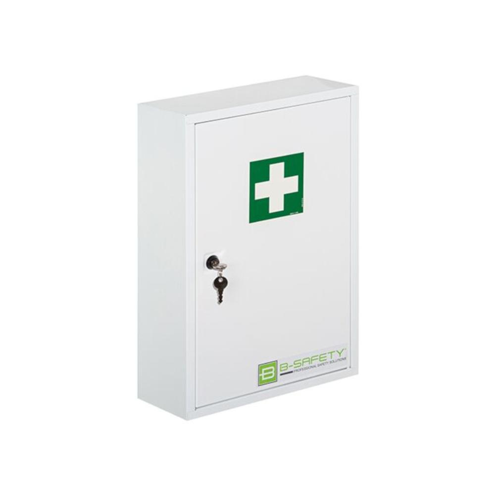 - Produktet er et robust førstehjælpsskab fremstillet af stålplade, designet til pålidelig brug i et arbejdsmiljø. Den hvide pulverlakerede overflade sikrer høj modstandsdygtighed over for ydre påvirkninger og muliggør nem rengøring.