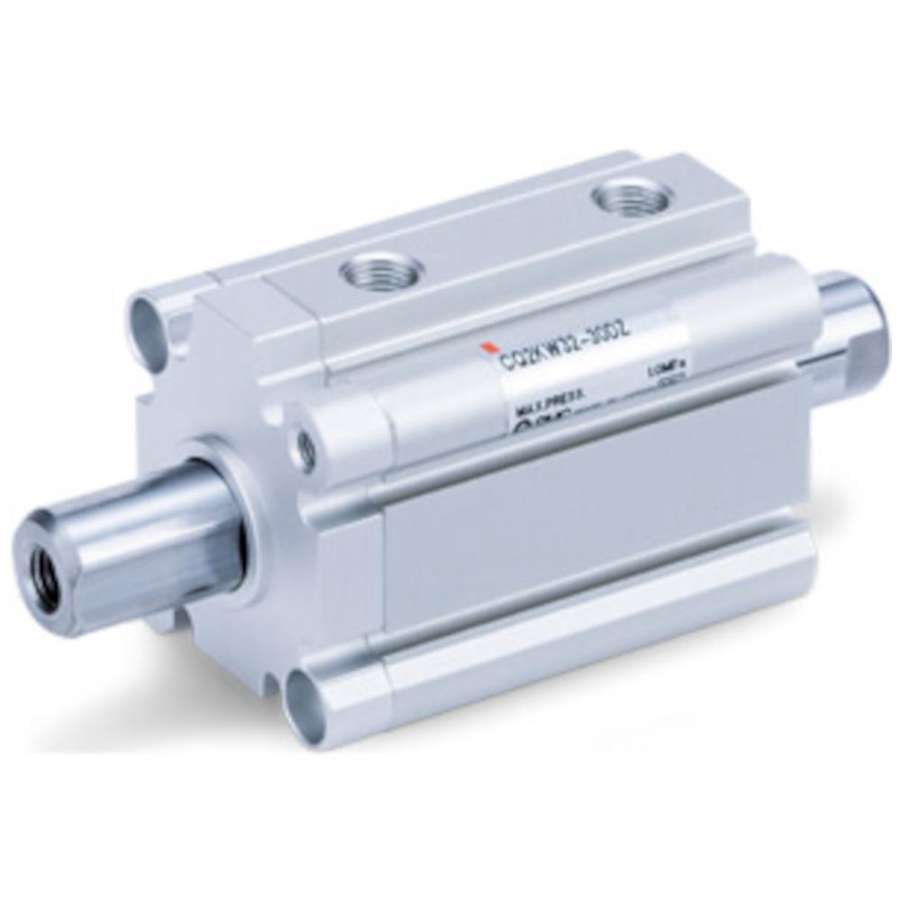 - Den dobbeltvirkende, rotationssikrede kompaktcylinder CDQ2KWB-DZ med gennemgående stempelstang og gennemgående boring muliggør præcise bevægelser med kraftpåføring fra begge sider.