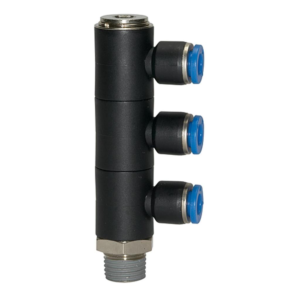 - L-multiple fordeleren "Blue Series" i 3-vejs udførelse anvendes til retvinklet fordeling af trykluft til tre slangeledninger.