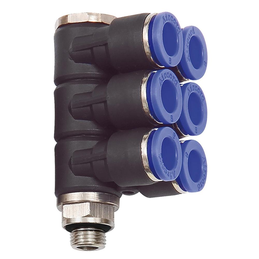 • Den L-formede multifordeler "Blue Series" er en 6-vejs drejelig pneumatisk fordeler til samtidig tilslutning af flere trykluftslanger via stikforbindelser.