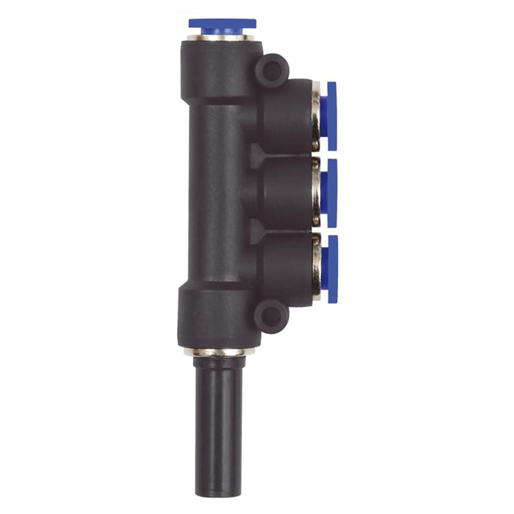 - T-multiple fordeleren med stiknippel "Blue Series" er en 3-vejs fordeler til fordeling af trykluft i pneumatiske systemer med flere slangetilslutninger af samme størrelse.