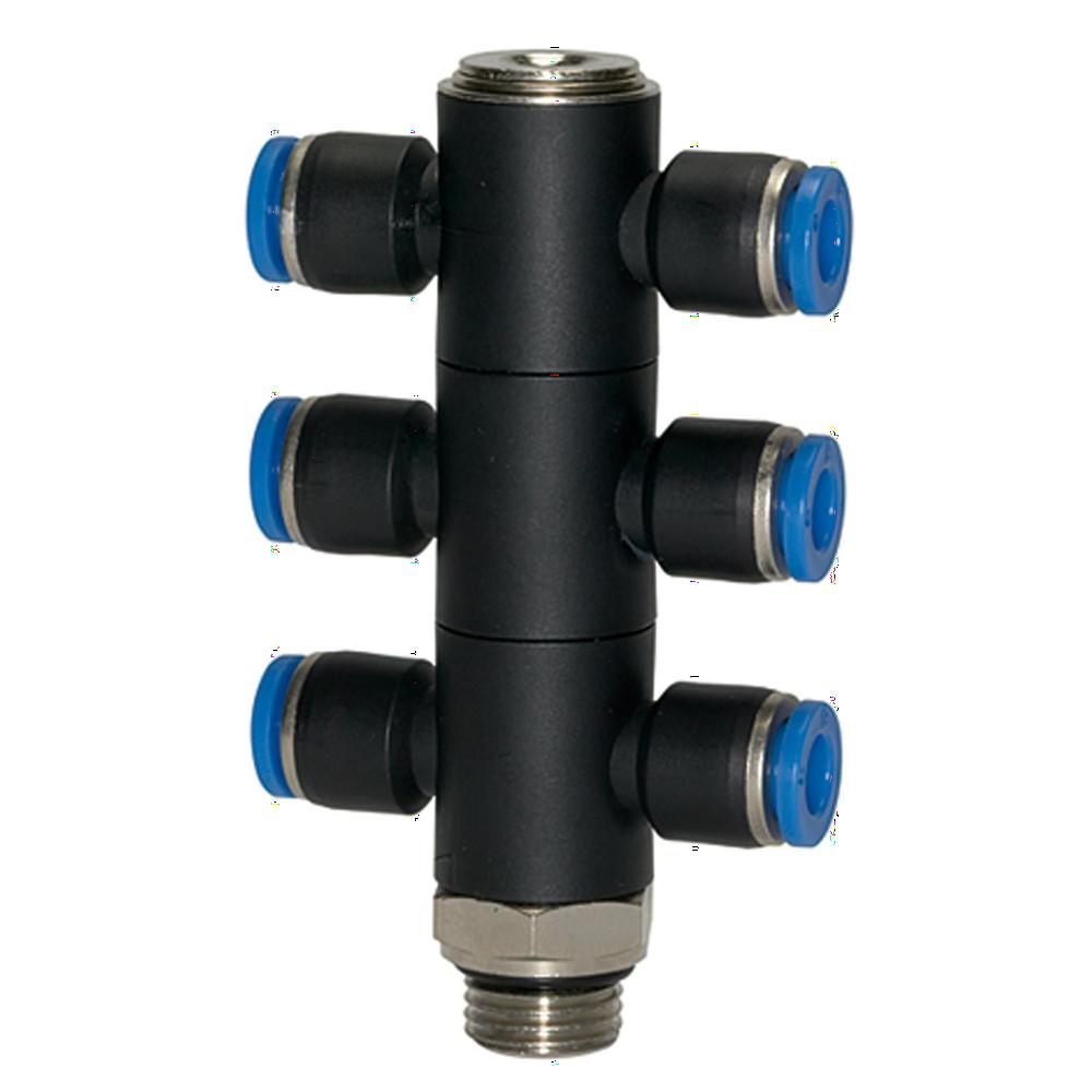 T-Multiple Fordeler Blå Serie - 6-vejs - drejelig - udvendig gevind G 1/8 til G 1/2 - slange udvendig diameter 4 til 12 mm - arbejdstryk -0,95 til 10 bar - maks. arbejdstryk (kortvarigt) 15 bar - plast/forniklet messing - pris pr. stk.