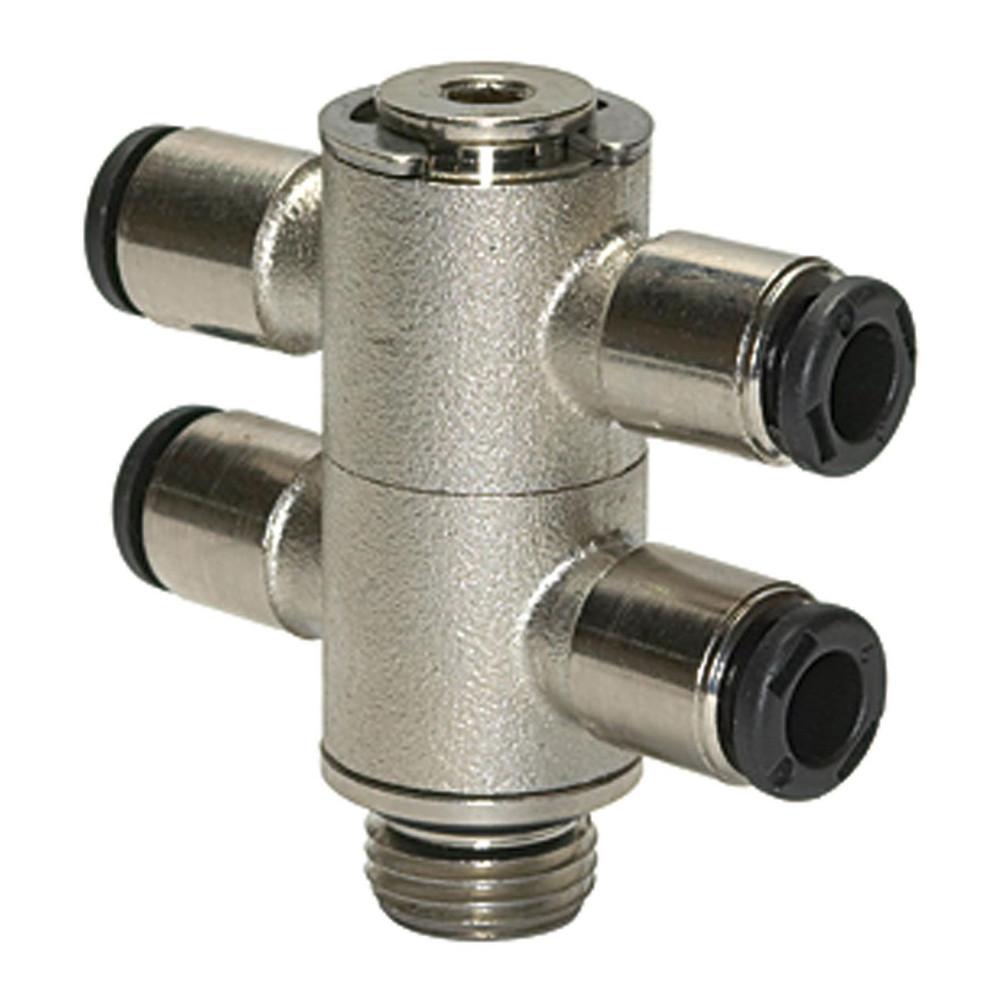 - T-multiple fordeleren 4-vejs er egnet til roterbar fordeling af trykluft til fire pneumatiske slanger i trykluft- og vakuumledninger.